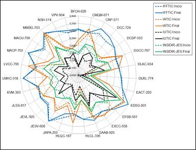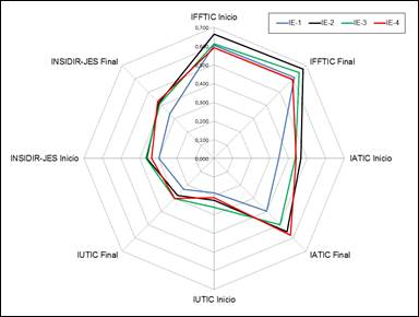 Figura 2 insidir-jes y sus subíndices, al inicio y final de la experiencia, correspondientes a cuatro de las instituciones educativas participantes.