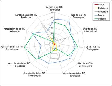 A pesar de la incorporación de actividades dirigidas, sobre todo en las dimensiones pedagógica, comunicativa y axiológica del estadio de apropiación de las TIC, sin ubicarse mayoritariamente en situación destacada, señala la necesidad de establecer estrategias institucionales dirigidas al mejoramiento de las competencias informáticas e informacionales del cuerpo docente, ya que la introducción de las TIC en el aula no es automática, sino que tiene especial relación con los usos y la valoración que los docentes den a tales recursos, tal y como lo señalan Marín, Ramírez y Maldonado (2016, p.198).