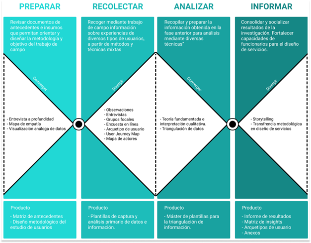 En la Fase 2. Recolectar, se hizo la recopilación de información en campo aplicando observaciones cualitativas, entrevistas, grupos focales y otras técnicas usadas en Design Thinking como User Journey Map (Mapa del recorrido del usuario).