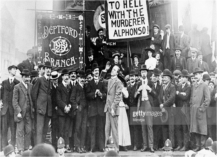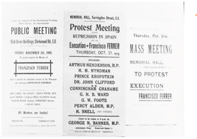 The image 13 depicts Victor Grayson addressing a gathering in Trafalgar Square during protests in England, where King Alfonso xiii is openly accused of murder in relation to Ferrer Guardia’s execution. Notably, this image was not published in the Spanish press. Other documents from the Ferrer Guardia archive in Barcelona, including three posters, reflect English solidarity for Ferrer Guardia. The first poster predates his execution, while the subsequent ones are from the period following his execution. These protests extended to various European countries, with notable demonstrations in France and England. Foreign photographs of the protests can be found in Getty Images, published by the Daily Mail55.