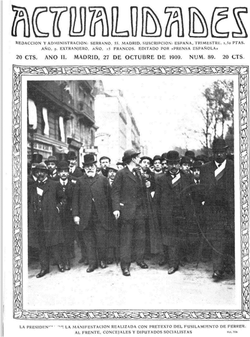 The international outrage over Ferrer’s execution initially led to demands for justice, with foreign protests preceding any action by the Spanish Left. These foreign protests resulted in the resignation of Prime Minister Maura on October 22, 1909, as he had refused to seek a pardon from the king. Spanish press coverage highlighted protests in major cities, especially in neighboring France. Surprisingly, within Spain itself, where Ferrer had few friends among left-wing communities, there was minimal mobilization to prevent his sentencing or protest against it53. Notably, three Spanish weeklies at the time—Actualidad, Actualidades, Nuevo Mundo, and Blanco y Negro—published photographs of the events.