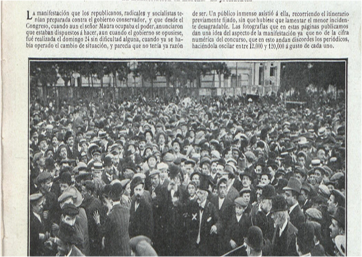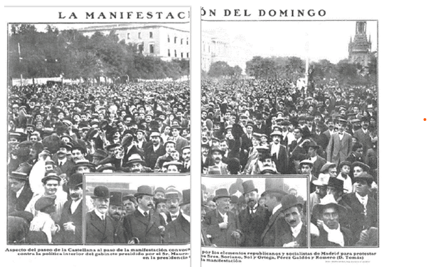 These photos were first printed a week after the events in Nuevo Mundo, titled “Madrid - A demonstration against Maura’s government” on pages 18 and 19 of the issue.