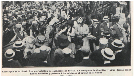The first press photograph shows troops crowded onto a ship while the Marquise of Comillas, the ship’s owner’s wife, distributes holy medals and tobacco pouches to drafted men. However, her husband, the second count of Comillas (1883-1925), had a controversial background, being the son of a slave trader and ship merchant. He was known for his close ties to the Catholic Church and his business dealings with them, including renting his ships to the Spanish army for transporting men to Morocco. Several illustrated magazines at the time, like Actualidad, Las Actualidades, and Nuevo Rumbo, published photos of the crowds and the Countess of Comillas distributing items.), who photographed Barcelona’s social life until 19179.