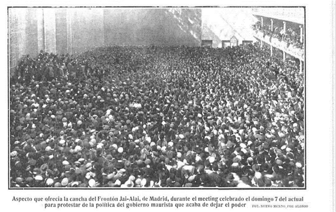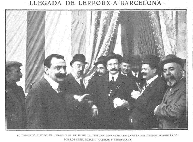 In the picture of Lerroux’s warm reception in Barcelona, notable figures accompanying him include Pablo Iglesias, Felix Azzati Descalci, (1874-1929) a republican freemason with anarchist sympathies, and Josep Serra Clara I Costa, (1862-1938), also a republican freemason and lawyer. Lerroux was expected to attend a rally at the Basque Handball Stadium in Madrid on the following Sunday, November 7, but he sent a letter expressing support and apologizing for his absence.