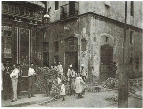 The barricades were built on Tuesday 27 when the workers’ strike became a general revolutionary strike. It was also when the Guardia Civil and the troops were shot at from balconies and private dwellings. The barricades were built by men, women and children. Over 300 square meters of cobblestones from the streets were used to build them16.