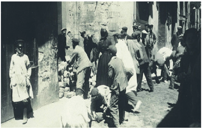 In this photograph, we see what Marin describes15. It depicts the building of a barricade. There is a sense of urgency since most figures are working on the same task and they are too busy to pose for photographs. The focus of the photograph is on the female figure dressed in black and the lads picking up cobblestones. On the right side of the image, we see the shadows of the roof top of a building, indicating that the photographer is shooting the photograph from inside a doorway. There is a single figure on the left with a cap covering his face as he looks at the photographer. To the left of the busy group there are four men looking on at the task in progress. One of the four male onlookers, one is distant from the others, he seems to be more middle class as he is wearing a jacket. The other three men in that group, are they overseeing the building of the barricade? They turned their back to the camera.