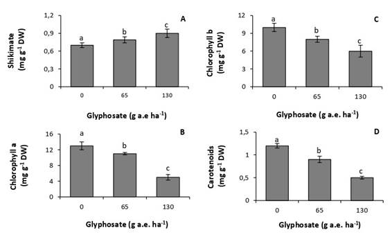 Doses of 65 and 130g a.e. ha-1 increased concentrations of foliar shikimate by 13% and 28%, respectively, with respect to the untreated control (Fig. 1A). Similarly, concentrations of photosynthetic pigments were very sensitive to the herbicide, decreasing at all tested doses (Fig. 2B, C, D). The lowest concentrations of chlorophyll a, chlorophyll b, and carotenoids were recorded at the dose of 130g a.e. ha-1, with reductions of 62%, 40%, and 50%, respectively, with respect to the control.