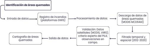 Para identificar las áreas de recurrencia de incendios forestales en la zona de amortiguamiento del PILA, procedimos a convertir los datos de áreas quemadas de formato vector a raster y luego realizamos una sumatoria con las ocho capas correspondientes para cada año (2012 al 2020) utilizando la herramienta estadística de celda del programa ArcGIS 10.4.1. Por último, realizamos una clasificación basada en la metodología empleada por Quesada-Román y Vargas-Sanabria (2022) . Presentamos un diagrama del flujo de los procesos empleados en la metodología para la identificación de las áreas quemadas. (Fig. 1)