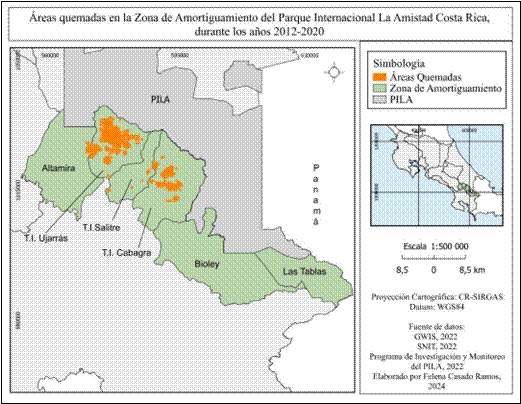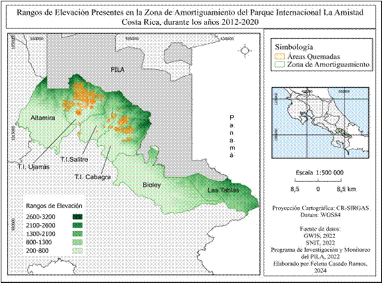 Introduction: Forest fires significantly affect ecosystems, altering vegetation, carbon cycles, and climate patterns. The buffer zone of La Amistad International Park, a UNESCO Biosphere Reserve and World Heritage Site, faces recurring forest fires that have not been thoroughly studied. Objective: To locate the historical fires in the area and assess their relationship with geographical variables. Methods: We analyzed satellite and field data for 2012-2020. Results: Most fires were above 1600m; steep inclines facilitate rapid fire spread while flatter areas contribute fuel accumulation. Grasslands exacerbate fire severity and spread, often related to land clearing near settlements. Access limitations and territorial restrictions are strong. Ujarrás experienced the largest impact (24,617 hectares); hotspots of recurring fires affected Ujarrás, with moderate occurrences in Salitre and Cabagra. Conclusions: Satellite technology provided essential data and identified hard to reach areas affected because of dry vegetation and human activity.