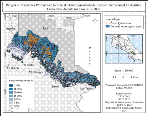 Fig. 11 Ámbitos de pendientes presentes en la Zona de Amortiguamiento del Parque Internacional La Amistad.