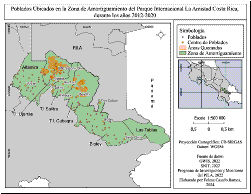 En la zona de estudio correspondiente a la zona de amortiguamiento del Parque Internacional La Amistad se han identificado el mayor número de incendios forestales atendidos por las autoridades del SINAC (SINAC, 2017). Aquí destacan comunidades de los pueblos originarios Bribri y Cabécar, distribuidos entre los Territorios Indígenas (T.I. de ahora en adelante) de Ujarrás, Salitre y Cabagra (González-Brenes y Elizondo-Sánchez, 2023), además de población campesina no indígena. En dichas comunidades se desarrollan diversas actividades sociales, económicas, productivas y recreativas, vinculadas con los diversos servicios ecosistémicos derivados de los recursos naturales del entorno inmediato, que podrían influir directa o indirectamente en los recursos del Parque Internacional La Amistad (SINAC, 2019).
