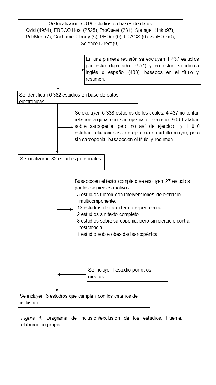 Fuentes de datos y búsqueda. La revisión sistemática incluyó estudios experimentales con intervenciones de ejercicio contra resistencia en personas adultas mayores diagnosticadas con sarcopenia. La búsqueda fue realizada desde marzo del 2016 y concluida en junio del mismo año en las siguientes bases de datos EBSCO HOST: Academic Search Complete, Education Research Complete, Erick, Medline, Sportdiscus, Fuente Académica Premier, Omnifile; OVID; PROQUEST: Public Health Database, Research Library; Science Direct; Springer Link; Cochrane Library; PubMed; Scielo; Lilacs; PEDro. La búsqueda fue realizada mediante la combinación de las siguientes palabras claves en inglés y en español “(sarcopenia) AND (suplementación) AND (masa muscular) AND (rendimiento físico) AND (fuerza muscular) AND (ejercicio de resistencia OR entrenamiento de resistencia) AND (ancianos OR envejecimiento OR adulto mayor) NOT animales”.