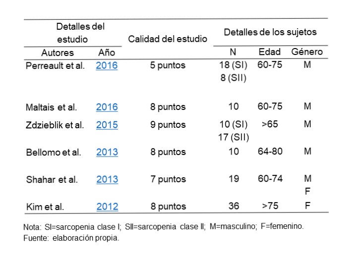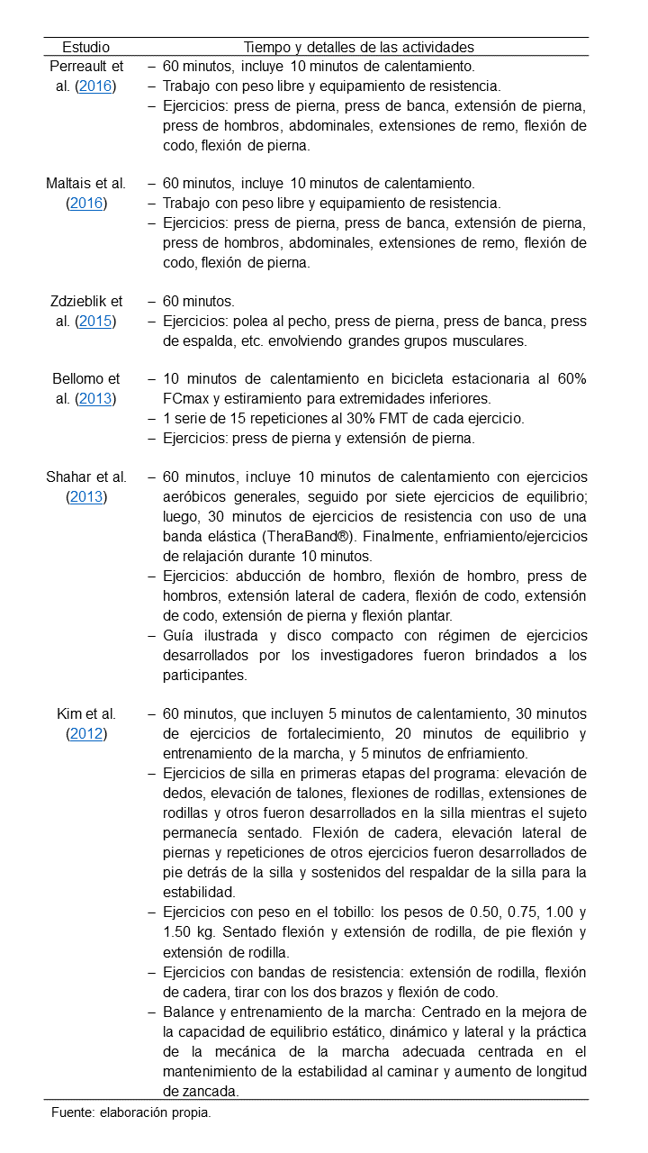Tomando en cuenta la necesidad de corroborar y establecer recomendaciones específicas para la población con sarcopenia, la presente revisión concuerda con la frecuencia de ejercicio reportada previamente (American Collage of Sport Medicine, 2014; Giallauria et al., 2015; Iolascon et al., 2014; Padilla et al., 2014). Asimismo, la cantidad de series, intensidad, descansos entre series y número de repeticiones, también concuerdan con las evidencias previamente reportadas (American Collage of Sport Medicine, 2014; Iolascon et al., 2014; Padilla et al., 2014).