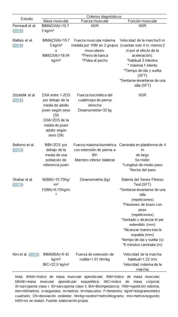 La literatura publicada permite identificar que existen numerosas maneras e incluso algoritmos para diagnosticar la sarcopenia (Baumgartner et al., 1998; Chen et al., 2014; Cruz, 2010; Fielding et al., 2011; Lera et al., 2015), así como diferentes pruebas y puntos de corte para evaluar masa, fuerza y función muscular; por lo tanto, no hay un consenso en relación con los criterios de valoración apropiados para el diagnóstico de esta enfermedad, lo cual dificulta la interpretación de los estudios realizados en este tema.