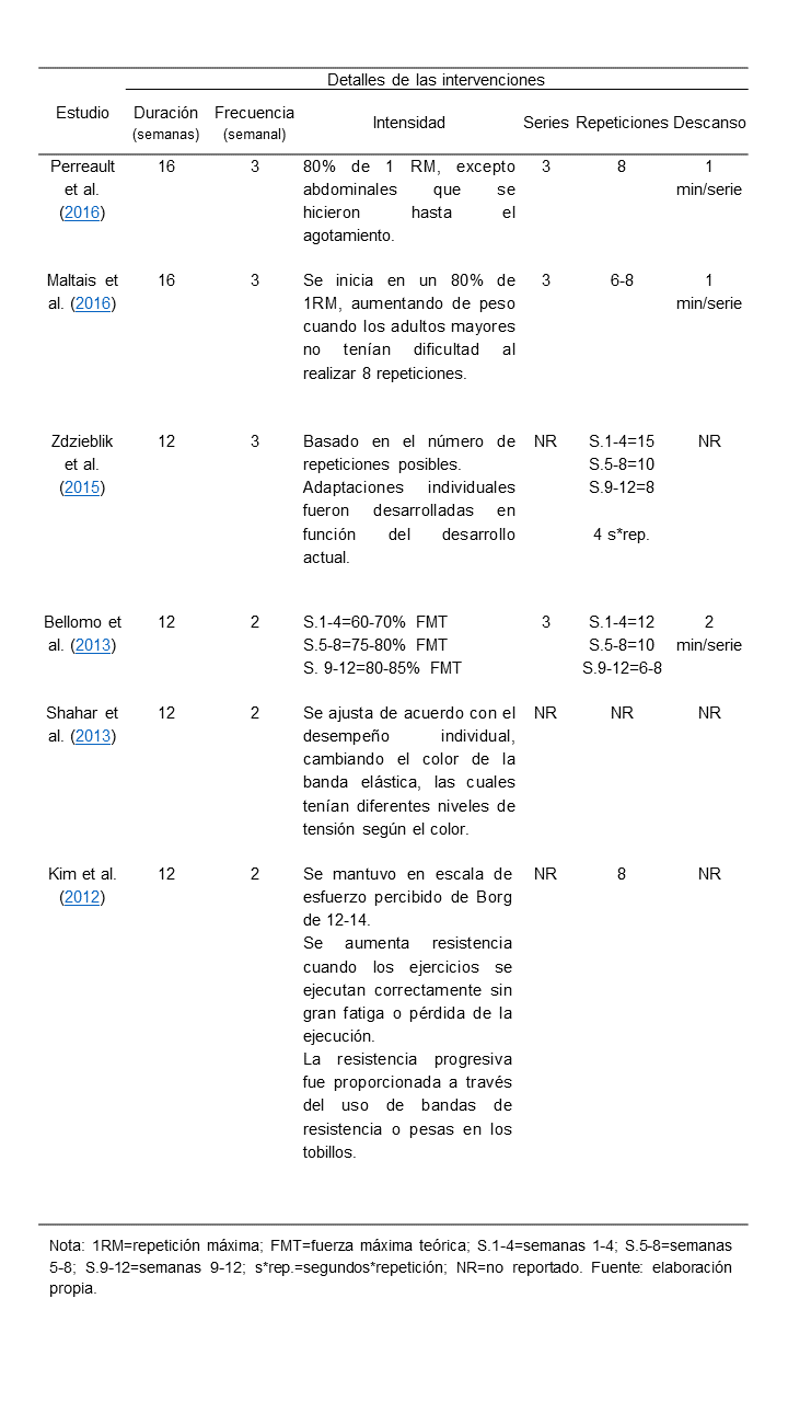 En cuanto a detalles de intervenciones, se han visto mejorías trabajando al menos 12 semanas con una frecuencia de 2-3 días durante 60 minutos de sesión y trabajando los principales grupos musculares a intensidades entre 70-85% (1RM) durante 3 series de 6-10 repeticiones con descansos de 1-2 minutos entre serie, esto ya sea trabajando con equipo de resistencia o ejercicios con peso libre.