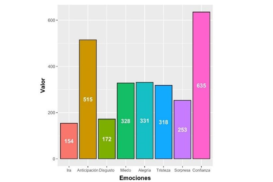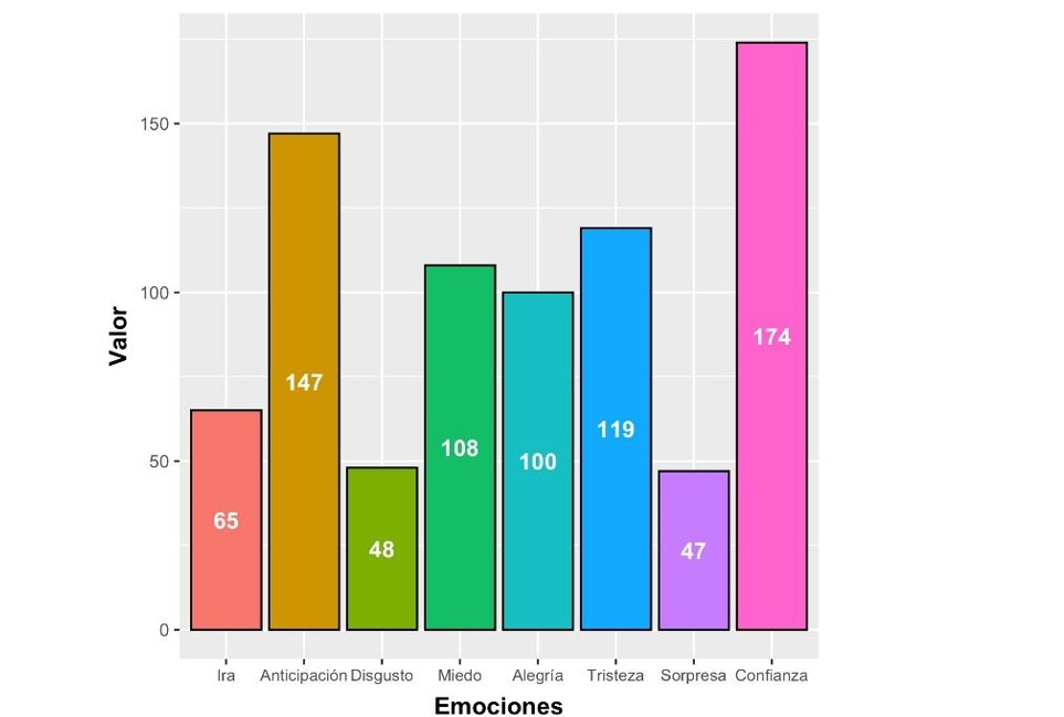 El análisis sentimental se llevó a cabo utilizando el paquete Syuzhet de R, basado en el NRC Emotion Lexicon que asocia palabras con ocho emociones básicas y dos sentimientos (Jockers, 2023; Mohammad y Turney, 2013). Los ocho conceptos figuran en inglés como lengua principal; sin embargo, para utilizarlo en textos en español se realiza una traducción automática muy fiable (Isasi, 2021).