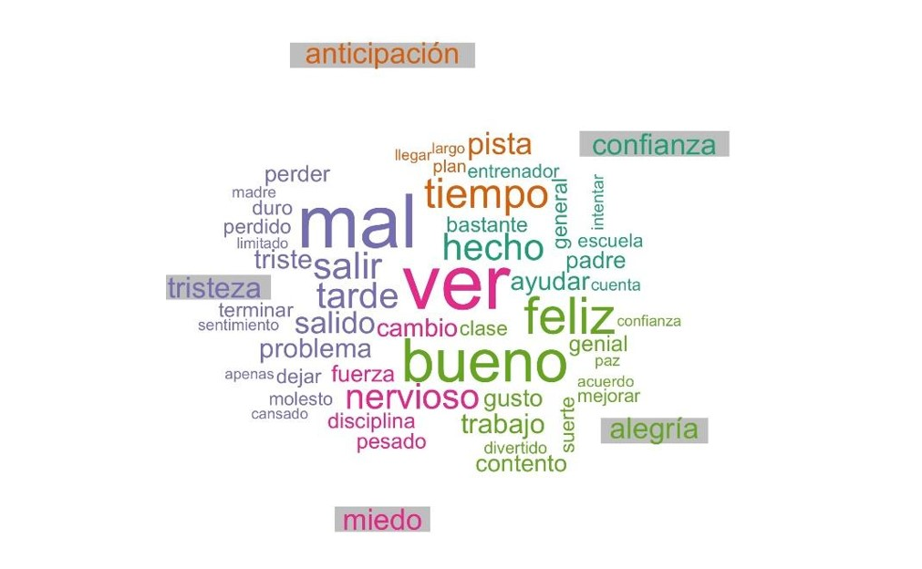 Por último, se obtuvo la nube de palabras, una de las formas más visuales para analizar los datos. Consiste en un gráfico con los conceptos clave más repetidos en el texto; el tamaño de cada uno indica la frecuencia con la que aparecen y el color representa la emoción básica con la que se relacionan. La asociación de conceptos con cada emoción se fundamenta en el NRC Emotion Lexicon (Mohammad y Turney, 2013), un recurso ampliamente utilizado en análisis de sentimientos y que asocia términos específicos con ocho emociones primarias y dos categorías sentimentales (positivo/negativo). Este diccionario ha sido desarrollado mediante un extenso proceso de anotación manual y validación empírica en estudios previos de lingüistíca computacional y análisis emocional de textos. En este estudio, la clasificación del léxico en cada emoción se basa en la asignación previa de términos en el lexicón y en su posterior validación dentro del contexto del texto analizado (Jockers, 2023; Mohammad y Turney, 2013).
