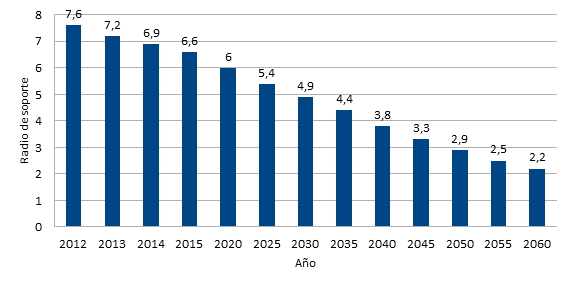 Sumado al radio de soporte, el cual es la relación personas económicamente activas cotizantes por persona jubilada es decreciente, lo que resulta de una inversión en la pirámide poblacional, es decir, cada vez tenemos menos hijos y vivimos más años. A su vez, esto implica una reducción en la fuerza de trabajo disponible, que trae consigo implicaciones importantes en la migración, dado que suelen ser más fecundos y jóvenes; por lo tanto, vienen a suplir necesidades de fuerza de trabajo, la productividad promedio del empleo y la rentabilidad de la cartera de inversiones del RIVM.