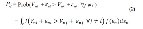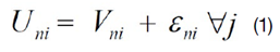 Donde, Uni es la utilidad aleatoria de un comprador potencial n con el producto i. Esta es fraccionada en dos partes, Vni y εni. Vni representa la utilidad aleatoria observable de un comprador, εni representa la utilidad aleatoria inobservable. Asumiendo que un comprador toma decisiones racionales, este elegirá un producto que maximiza su utilidad aleatoria. Por ejemplo, asumamos que hay J número de productos. Un comprador elegirá el producto i si este producto provee la más alta utilidad aleatoria entre J número de productos. Utilizando la estimación de probabilidad máxima, la probabilidad de elegir el producto i sobre el producto J es expresada en