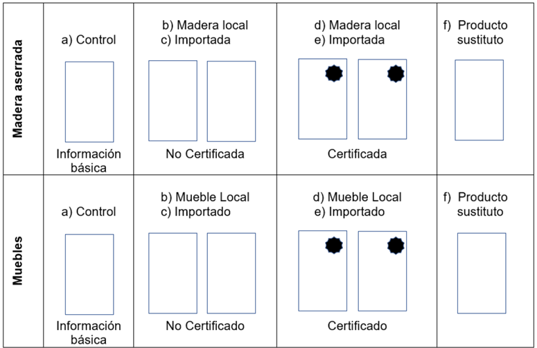 Fase I: Evaluación de preferencias e intención de compra: En esta fase se estimaron las variaciones en la preferencia e intención de compra de productos de madera aserrada y muebles. Esto se realizó utilizando anuncios publicitarios ficticios, los cuales fueron creados con el soporte de un diseñador gráfico, con el fin de determinar la respuesta de los compradores finales o intermedios tanto de madera aserrada como de muebles, tomando en cuenta los siguientes atributos: