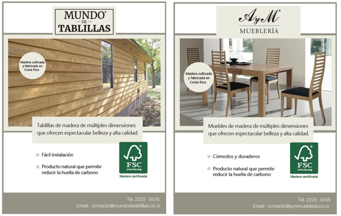 Figura 2 Ejemplos de anuncios utilizados en el estudio. Ambos casos muestran madera local certificada, el de la izquierda dirigido a un consumidor intermedio y el de la derecha a un consumidor final.