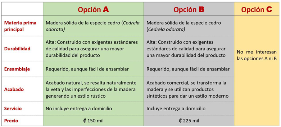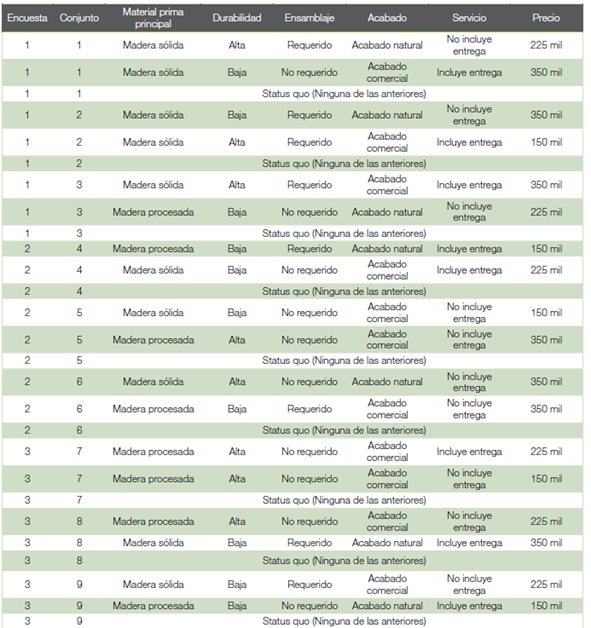 Fase II: Evaluación de atributos a través de experimento de elección: Para obtener información adicional sobre los productos de madera, se utilizó la técnica conocida como ''experimentos de elección”. Estos son una forma efectiva para conocer las preferencias de los consumidores, en cuanto a bienes que no necesariamente son mercantiles, esta información se recopila por las características esperadas o atributos del producto (10)-(12). Las técnicas de modelado de elección asumen que los bienes o servicios pueden ser descritos en términos de sus atributos o características, y los niveles que estos necesitan. El enfoque está estimar el valor que los participantes ponen en estos atributos.