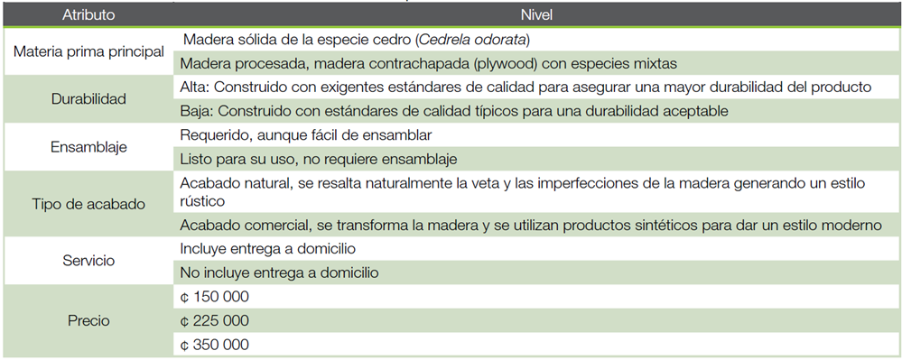 Se establecieron seis atributos (Cuadro 1), cada uno de ellos considerados importantes de acuerdo a lo evidenciado en investigaciones anteriores (3), (6), (9), (22), (23). Cinco de estos atributos se dividieron en dos niveles y el atributo precio se dividió en tres niveles (aproximadamente con incrementos de 50 %), para obtener una mayor precisión en los valores de otros atributos con base en el precio.