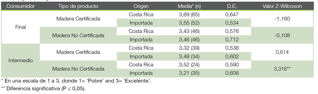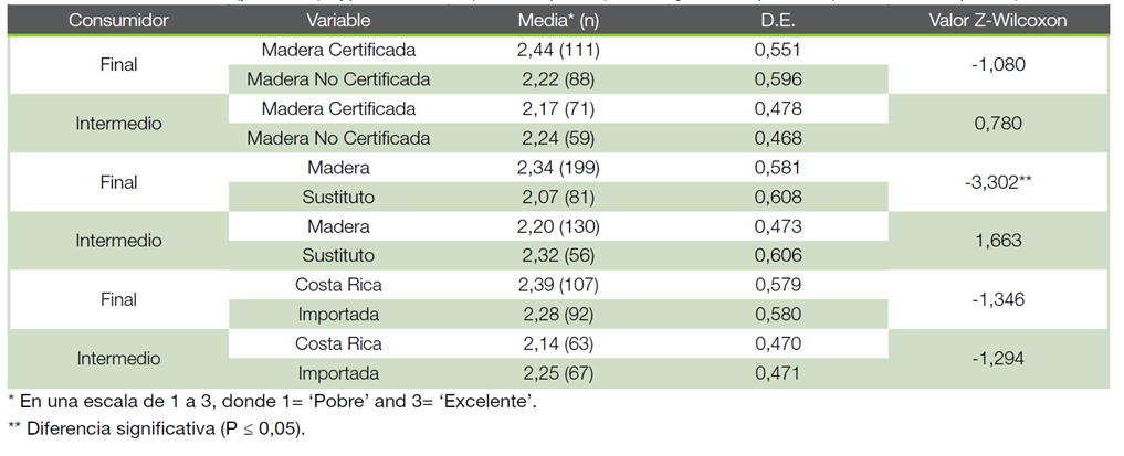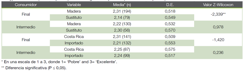 Percepción sobre el desempeño general del producto: Como se puede observar en el Cuadro 3, la tendencia por preferir muebles de madera es mayor (X=2,31) que por muebles con productos sustitutos (X=2,14) para consumidores finales (Wilcoxon Z= -2,339; G.L.= 1; P= 0,01). Para los consumidores intermedios, existe una tendencia hacia muebles con productos sustitutos; sin embargo, no se encontró una diferencia significativa (Wilcoxon Z= 0,978; G.L.= 1; P=0,328).