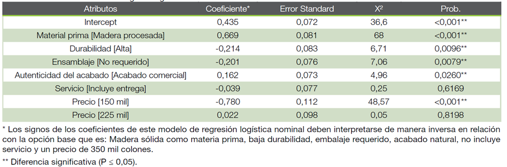 En el Cuadro 7 se observan los resultados del modelo logístico de regresión nominal que se ajustó de manera óptima (X2= -116,32 G.L.= 7, P= < 0,001). Específicamente, la utilidad que las personas consumidoras le dan a un producto hecho con madera sólida (de la especie cedro) es mayor que a la madera procesada (madera contrachapada conocida como plywood con especies mixtas), prefiriendo además un producto maderable de alta durabilidad, que no requiere ser ensamblado, con un acabado natural que resalta naturalmente la veta y las imperfecciones de la madera generando un estilo rústico, y como era de esperar, dispuesto a pagar el menor precio posible (150 mil colones). Encontramos que solamente el atributo de servicio de entrega a domicilio mostró ser indiferente para los consumidores (X2= -0,039, G.L.= 1, P= 0,6169). Para consumidores en el mercado de EE. UU. como en el de China, igualmente se encontró preferencia por un producto de madera sólida por encima otros materiales ingenieriles de madera (24).