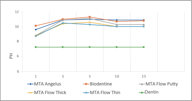 The pH of the solutions in contact with the cement showed the highest peak on the fifth day (from 11.3 to 10.3). On the tenth day, there was a slight drop in all the samples (10.9 to 10). Biodentine showed the highest pH at each interval and reached alkalinization faster. MTA Flow® showed similar behavior during the experimental period, regardless of the consistency used (Figure 2). These findings are consistent with the theory of biomineralization, which describes that at a physiological pH, the formation of carbonate apatite occurs in a two-phase process. The first occurs in the initial 5 days, where the Ca/P ratio is lower (1.58) and is associated with an increase in pH (from 11.3 to 10.3), favoring the formation of amorphous calcium phosphate. During the second phase, an increase in the Ca/P ratio (1.84) is observed, and a slight drop in pH (from 10.9 to 10). In this study, the decrease occurred from day 10 in all cases, which can be attributed to the incorporation of hydroxyl ions (OH-) released by the cement, to the OH- sites of the apatite, promoting the conversion of carbonate apatite (15). Therefore, it is clear that from the day of exposure, the process of biomineralization begins.