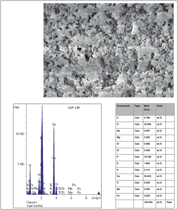 The chemical composition of the precipitates was determined using an SEM micro-energy dispersion analysis (EDAX) (HITACHI, S-570). To analyze the ultrastructural aspect, the precipitates were photographed at variable magnifications (500-2500X). The data were recorded and analyzed descriptively.