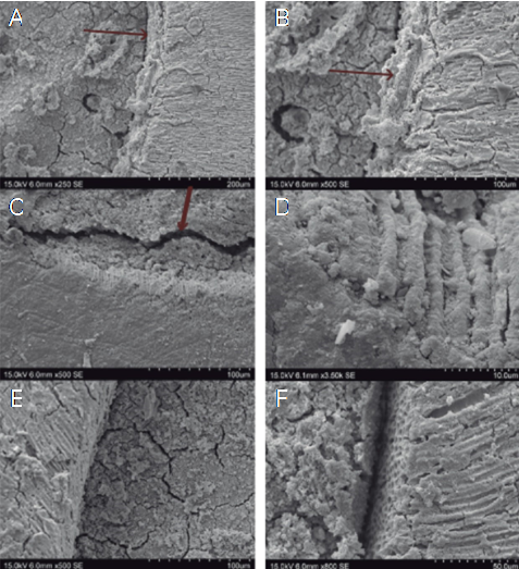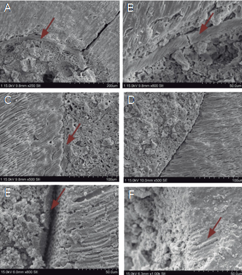 Figure 6 Representative micrographs of the MTA Angelus group. A, B. The formation of the apatite interface is observed (arrow). C, D. SEM Artifact - separation of cement can be observed (arrow), however the apatite interlayer remains attached to the dentin and tubular mineralization is demonstrated. E, F. It is shown that the formation of the apatite interlayer was not found in all regions circumferentially.