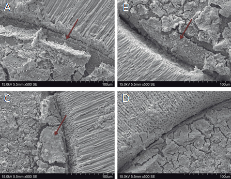 Figure 7 Representative microphotographs of G2 - Biodentine. A, B, C. The formation of the apatite interface can be observed (arrow). D. Apatite interface formation was not found in all circumferential regions.