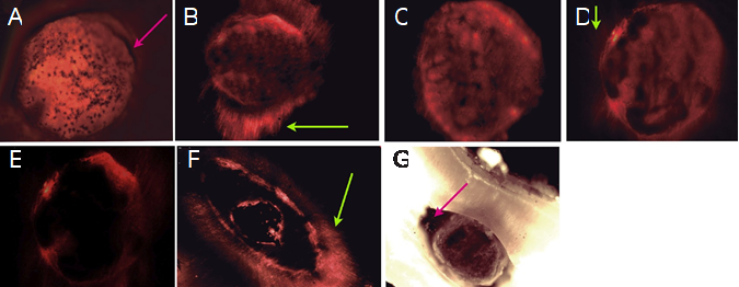 Figure 9 Representative fluorescence microphotographs of the different groups. A. MTA ANGELUS showed presence of few areas with marginal gaps (Arrow). Most of the periphery has good marginal adaptation. B. The dentin infiltration of the material, tag-like formation (green arrow) and marginal adaptation around all Biodentine/dentin interface can be observed. C. MTA Flow® Putty showed good marginal adaptation to dentin. D. MTA Flow® Thick demonstrated some intratubular infiltration (green arrow). E and F MTA Flow® Thin showed open areas and discontinuous marginal adaptation. Also denoted areas within the material with big voids demonstrating loss of mass during PBS immersion. However is possible to observed intratubular infiltration (green arrow). G. MTA Flow® Thin Photomicrograph showed loss of mass and/or contraction of the cement (arrow). After 15 days of immersion in PBS, the cement do not demonstrated mass stability nor marginal adaptation.