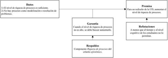 El segundo resultado para destacar de este estudio se vinculó con la incidencia de los CID en la estructura de los argumentos prácticos según el modelo de Toulmin. En primer lugar, los componentes de los CID se utilizaron para identificar elementos de la UD que funcionaron como datos en los argumentos; en segundo lugar, se utilizaron como respaldos ya que, en el contexto de esta investigación, las personas participantes conocían los CID y sus componentes en profundidad; por último, permitieron generar garantías específicas para proponer una acción en la premisa. De manera similar a los hallazgos de Molina et al. (2023), quienes también utilizaron el modelo de Toulmin, este estudio permitió identificar explícitamente las razones de las propuestas de quienes participaron, las cuales se relacionaron con los componentes de los CID.