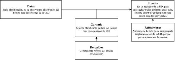 En la valoración con el componente tiempo, algunas de las personas participantes comentaron que no hubo una distribución del tiempo de la clase durante la etapa de diseño de la UD. Si bien se consideró distribuir cada sesión en inicio-desarrollo-cierre con un tiempo aproximado para cada parte, esta distribución no se llevó a cabo. A partir de la reflexión anterior, surgió una propuesta para ajustar los tiempos, la cual se estructuró en el argumento práctico de la Figura 5.