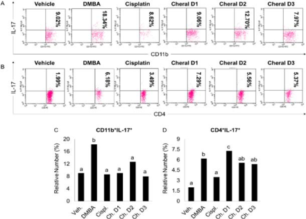 Figure 2 The immunosuppressive effects of cheral extract toward CD11b+IL-17+ macrophages (A and C) and CD4+IL-17+ T helper 17 cells (B and D) in DMBA-induced mice. The significance level was set at p < 0.05. Different alphabetic characters on the graph indicate a substantial difference.