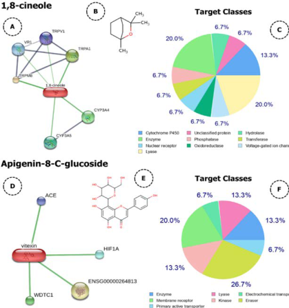 Figure 3 Compounds-proteins interaction network analysis (A and D), chemical structure (B and E), and target protein (C and F) of cheral’s bioactive compounds.