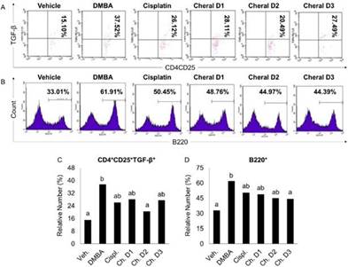 Figure 5 The immunosuppressive effects of cheral extract toward CD4+CD25+TGF-β+ Treg cells (A and C) and B220+ B cells (B and D) in DMBA-induced mice. The significance level was set at p < 0.05. Different alphabetical characters on the graph indicate a substantial difference.