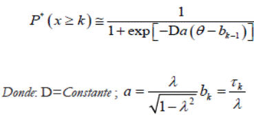 En donde el parámetro hace referencia a la discriminación del ítem e indica la asociación del ítem con el rasgo; λ corresponde a la correlación entre θ y el continuo que se presenta en las categorías de respuesta; este valor oscila entre 0.3 y 2.5 (Abad, Olea, Ponsoda y García, 2011). El parámetro b k está relacionado con el nivel de θ en el cual la probabilidad de elegir una categoría o una superior es igual a 0.5; y está dada por (b (k-1)-b k )/2 (Abad, Ponsoda y Revuelta, 2006); τ k es el punto de corte entre las categorías y corresponde a cada uno de los parámetros b k.