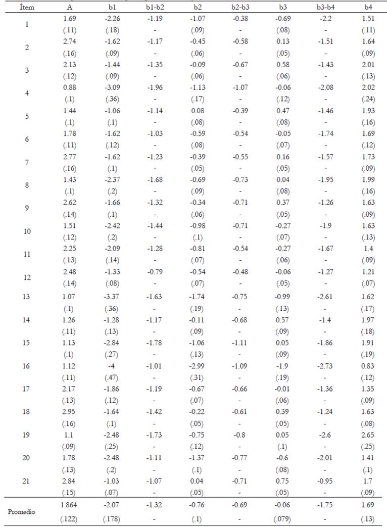 Tabla 4: Parámetros de los ítems para el modelo de respuesta graduada de Samejima
