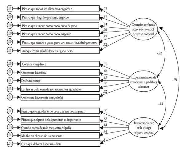 Tras el análisis, el instrumento final quedó conformado por 16 reactivos distribuidos en tres dimensiones: creencias erróneas acerca del control del peso corporal, formada por seis reactivos; experimentación de emociones agradables al comer e importancia que se le otorga al peso corporal, constituidas por cinco reactivos cada una (véase tabla 1). De acuerdo con lo observado, estas presentan valores de confiabilidad y validez adecuada. La especificación de las propiedades del instrumento y sus reactivos se describen más adelante en el texto.