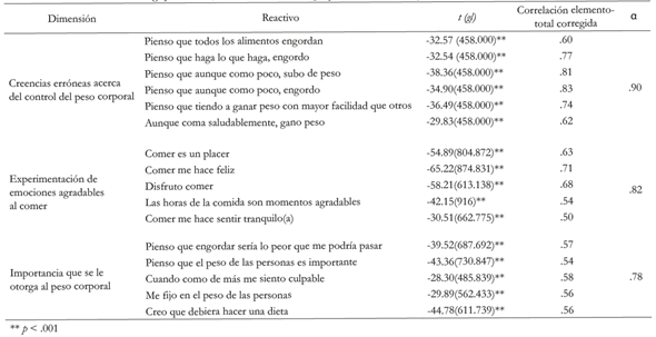 Eliminar estos reactivos ocasionó que, tanto los factores desinhibición situacional y comer emocional, quedaran conformados por únicamente dos reactivos respectivamente. Al ya no poder ser considerados como factores, en los siguientes análisis se trabajó únicamente con tres dimensiones: a) creencias erróneas acerca del control de peso, b) experimentación de emociones agradables al comer y c) importancia que se le otorga al peso corporal (tabla 1). Posteriormente, con solo tres dimensiones y 16 reactivos, se probó la discriminación de los reactivos usando grupos extremos. Los resultados muestran que todos los reactivos probados permiten discriminar entre los grupos, por lo cual no se descartaron reactivos en este paso (tabla 2).
