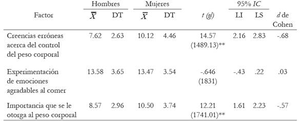 La confiabilidad se probó con el α, los tres factores mostraron adecuados niveles de confiabilidad (tabla 2). Se obtuvieron diferencias entre hombres y mujeres en cada uno de los factores, ya que suele haber diferencias entre variables asociadas a la alimentación y el peso entre sexos (Ramos et al; 2016); y se observó que las mujeres presentaron mayores niveles de creencias erróneas acerca del control de peso y de importancia que le otorgan al peso corporal, pero no hubo diferencias entre sexos respecto a la experimentación de emociones agradables al comer (tabla 3).