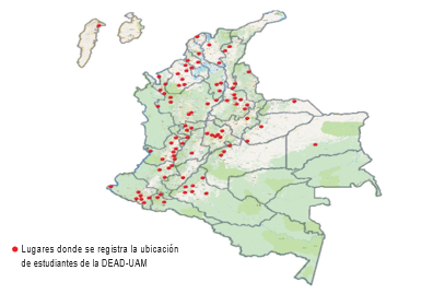 No obstante, dados los múltiples puntos geográficos de residencia de los estudiantes (25 de 32 departamentos de Colombia) el desarrollo de los programas del Departamento de Estudios a Distancia (DEAD UAM), implica hacer uso de las TIC para la incorporación al espacio laboral. Por otra parte, existen poblaciones con características especiales que requieren de modelos innovadores propios, adecuados para responder a las necesidades del estudiantado. Para comprender a profundidad esta situación, es necesario conocer las características estudiantiles del DEAD-UAM: las personas vinculadas a los programas académicos se ubican en áreas rurales dispersas o viven en cascos urbanos de municipios habitados por menos de 30.000 personas, lo cual dificulta, en muchos casos, el establecimiento de compromisos y acuerdos con organizaciones públicas y privadas para la realización de prácticas empresariales y sociales. En la Figura 1, se presenta la ubicación geográfica del estudiantado para el año 2021: