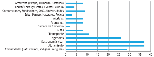 En el segundo semestre de 2020, la pandemia por la COVID-19 afectó directamente al sector turístico. Como una estrategia para orientar a los prestadores de servicios turísticos en cuanto a la forma de reactivar la industria, se diseñó una metodología que incluye la actualización del patrimonio, estudio del mercado, desarrollo de protocolos bioseguros, diseño de experiencias turísticas y su conformación en paquetes, perfeccionamiento de la comercialización digital y mejora de la calidad del servicio. Se realizaron análisis en 29 municipios del país, se consolidó la información en cartillas digitales contextualizadas y el producto fue socializado a los tipos de actores de la cadena de valor del turismo que se observan en la figura 11.