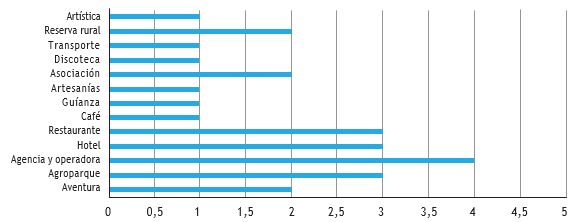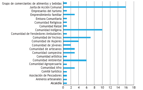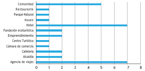 En el último periodo, enfocado en la temática del turismo comunitario. los principales resultados se destacan en seguida. Inicialmente, se seleccionaron y apoyaron 25 organizaciones turísticas, realizando un direccionamiento estratégico consistente en caracterizar la empresa, diagnosticar el impacto económico, social, ambiental y cultural de su operación en la comunidad y formular acciones orientadas a fortalecer las oportunidades, anticiparse a las amenazas, mejorar las debilidades y apuntalar las fortalezas. Por otro lado, se ha apoyado a dichas organizaciones para que diseñen experiencias turísticas y formulen planes de mercadeo, ya que la comercialización es uno de los principales obstáculos que enfrentan los emprendimientos turísticos. Los principales tipos de organización intervenidos se presentan en la figura 8: