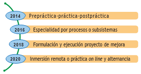 La experiencia de las prácticas virtuales mostradas hasta el momento son constantemente monitoreadas y evaluadas para reorientarse conforme se presenten obstáculos u oportunidades de mejora. Para evidenciar este hecho se mostrarán los cambios históricos dados en las asignaturas durante del periodo de análisis (2014-2020). A lo largo de los últimos seis años, la práctica empresarial en el DEAD UAM se ha destacado por su dinamismo, incluyendo elementos diferenciadores capaces de imprimir la evolución por etapas, mostrada en la figura 12.