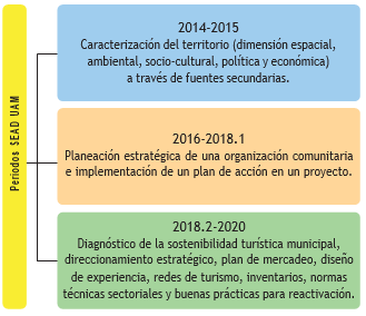 Esta práctica social es una asignatura que el estudiantado de la UAM debe cursar durante un semestre antes de finalizar sus programas profesionales. Busca orientar la formación de ciudadanos y profesionales competentes y comprometidos con el desarrollo regional sostenible, a partir de la implementación de metodologías participativas aplicables en contextos reales, con miras a la comprensión del territorio. Aunque existe un esquema para los programas presenciales, en esta oportunidad se comentará la adaptación que el Departamentos de Estudios a Distancia ha hecho para los programas de Administración de Empresas y Negocios Internacionales en esta modalidad (a distancia y virtuales). El estudiantado está ubicado en diferentes puntos de la geografía nacional, lo cual aumenta la complejidad logística y temática, pero, al mismo tiempo, enriquece los alcances y beneficiarios. Durante el periodo 2014-2020, se ha reorientado tres veces para desembocar en el esquema que se presenta en la figura 6: