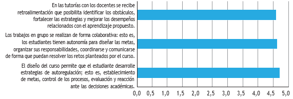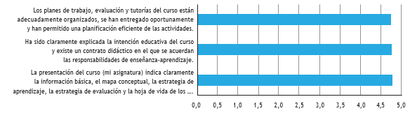 Las asignaturas cuentan con un espacio destinado a proporcionar las indicaciones generales al estudiantado, con el fin de que conozca las generalidades de las prácticas, como: los diferentes planes, las competencias, los resultados de aprendizaje, el contrato didáctico y las estrategias de enseñanza, aprendizaje y evaluación. En este marco, cada semestre se realizan auditorías de aulas, para verificar los elementos del Modelo de Entornos Convergentes MEC Complexus, con miras a mantenerlos actualizados y adaptados a las exigencias cambiantes. Según la figura 14, el estudiantado valora con 4,7/5,0 las generalidades, muestra interés incluso desde antes del inicio del curso y aprueba la metodología e idoneidad del profesorado; no obstante, según su criterio, es posible incrementar el grado de interacción, mediante el empleo de diversidad de herramientas de la comunicación, tal como son las redes sociales. En este sentido, se deben buscar los mejores recursos virtuales para que el estudiantado los aplique en el desarrollo de sus prácticas.
